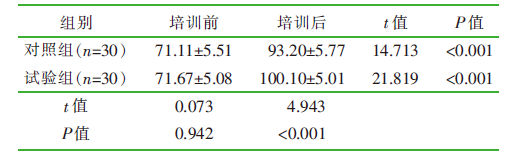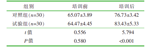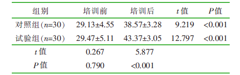 目的 探讨主题游戏在精神科护士对患者攻击行为管理培训中的应用效果。 方法 2024年10月,采用便利抽样法,选择来自浙江省某三级甲等精神专科医院10个病区的60名精神科护士为研究对象,以病区为单元将其随机分为对照组(n=30)和试验组(n=30),围绕患者攻击行为管理,对照组接受理论授课与现场实操、微视频教学相结合的培训,试验组接受基于主题游戏的培训,比较两组培训前后患者攻击行为管理理论知识考核成绩、工作场所暴力应对资源、自信得分。 结果 培训后,试验组的患者攻击行为管理理论知识考核成绩、工作场所暴力应对资源、自信得分优于对照组(t=5.794、4.943、5.877,均P<0.001)。 结论 主题游戏能提高精神科护士对患者攻击行为管理培训的效果,提升护士的工作场所暴力应对资源、自信水平,值得推广。