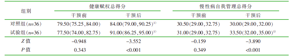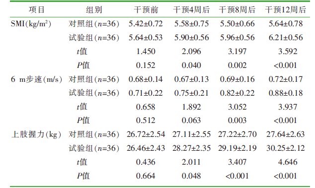 目的 构建社区老年肌少症患者自我管理干预方案,并评价其应用效果。 方法 结合健康赋权理论,通过文献回顾和专家会议法构建社区老年肌少症患者自我管理干预方案。选取2024年6月—9月于南京市某三级甲等医院老年科就诊的72例老年肌少症患者为研究对象,采用随机数字表法,将其随机分为对照组(n=36)和试验组(n=36)。对照组接受常规护理;基于构建的社区老年肌少症患者自我管理干预方案,结合常规护理对试验组进行干预。比较干预前后两组健康赋权及慢性病自我管理水平,干预前、干预4周、8周和12周后两组四肢骨骼肌质量指数(skeletal muscle mass index,SMI)、6 m步速、上肢握力。 结果 干预后,试验组健康赋权、慢性病自我管理水平高于对照组(P<0.05)。重复测量方差分析结果显示,两组干预前、干预4周、8周和12周后的SMI、6 m步速、上肢握力时间与组别的交互效应具有统计学意义(P<0.05)。试验组干预4周、8周和12周后的SMI、上肢握力优于对照组(P<0.05),干预8周和12周后的6 m步速快于对照组(P<0.05)。 结论 社区老年肌少症患者自我管理干预方案的运用能够提高社区老年肌少症患者的健康赋权和慢性病自我管理水平,改善其肌少症。