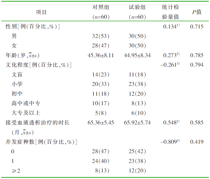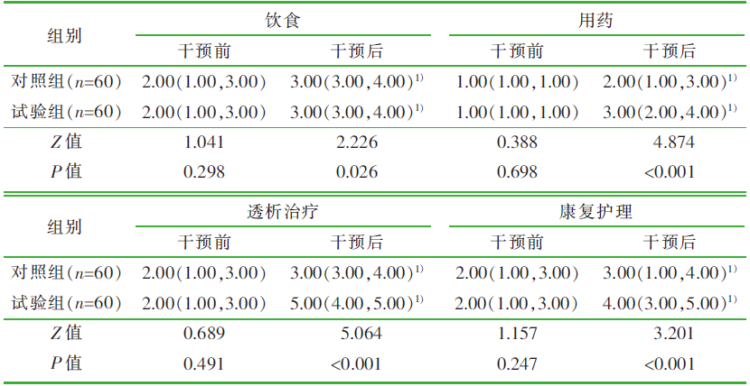 Objective To explore the effects of peer education combined with experiential scenario-based intervention in improving the self-care behavior for arteriovenous fistula in hemodialysis patients. Methods A total of 120 patients undergoing hemodialysis via arteriovenous fistula at the hospital from April to June 2025 were selected as the participants and randomly divided into a control group and an experimental group(60 cases each). The experimental group received peer education combined with experiential scenario-based intervention in addition to the routine care,while the control group received routine health education. The scores of the Hemodialysis Patient Knowledge Questionnaire(HPKQ),Self-rating Depression Scale(SDS),Self-rating Anxiety Scale(SAS),Connor-Davidson Resilience Scale(CD-RISC),and Assessment of Self-care Behaviors with Arteriovenous Fistula in Hemodialysis(ASBHD-AVF) were compared between the two groups before and after the intervention. Results After the intervention,the experimental group showed superior performance in all dimensions of the HPKQ,total scores of the SDS,SAS,and CD-RISC,as well as the total scores and dimensional scores of the ASBHD-AVF compared to the control group(all P<0.05). Conclusion Peer education combined with experiential scenario-based intervention demonstrates favorable effects in enhancing the mastery of self-care knowledge,improving psychological conditions,and promoting the development of arteriovenous fistula self-care behaviors among hemodialysis patients,making it worthy of clinical application and promotion.